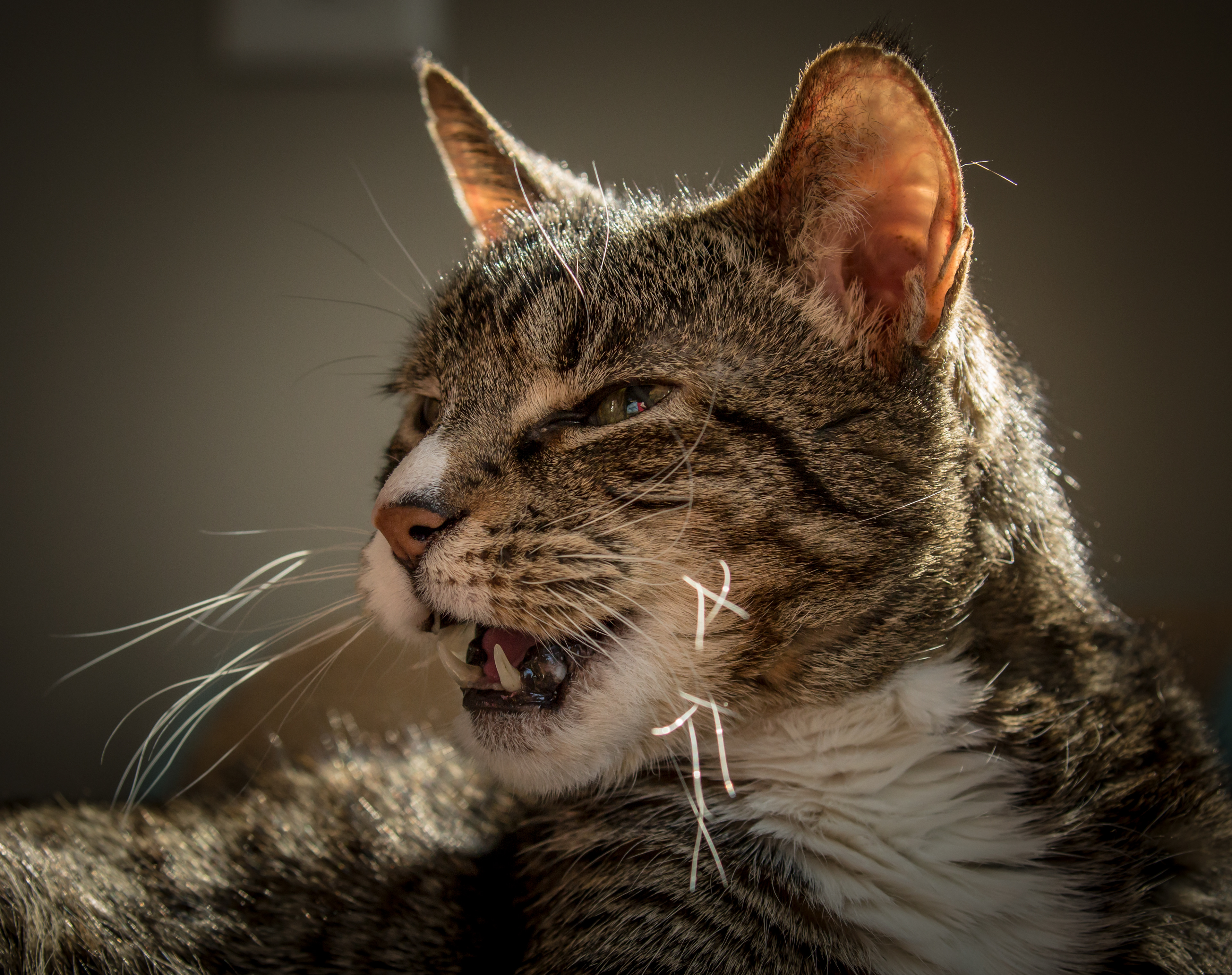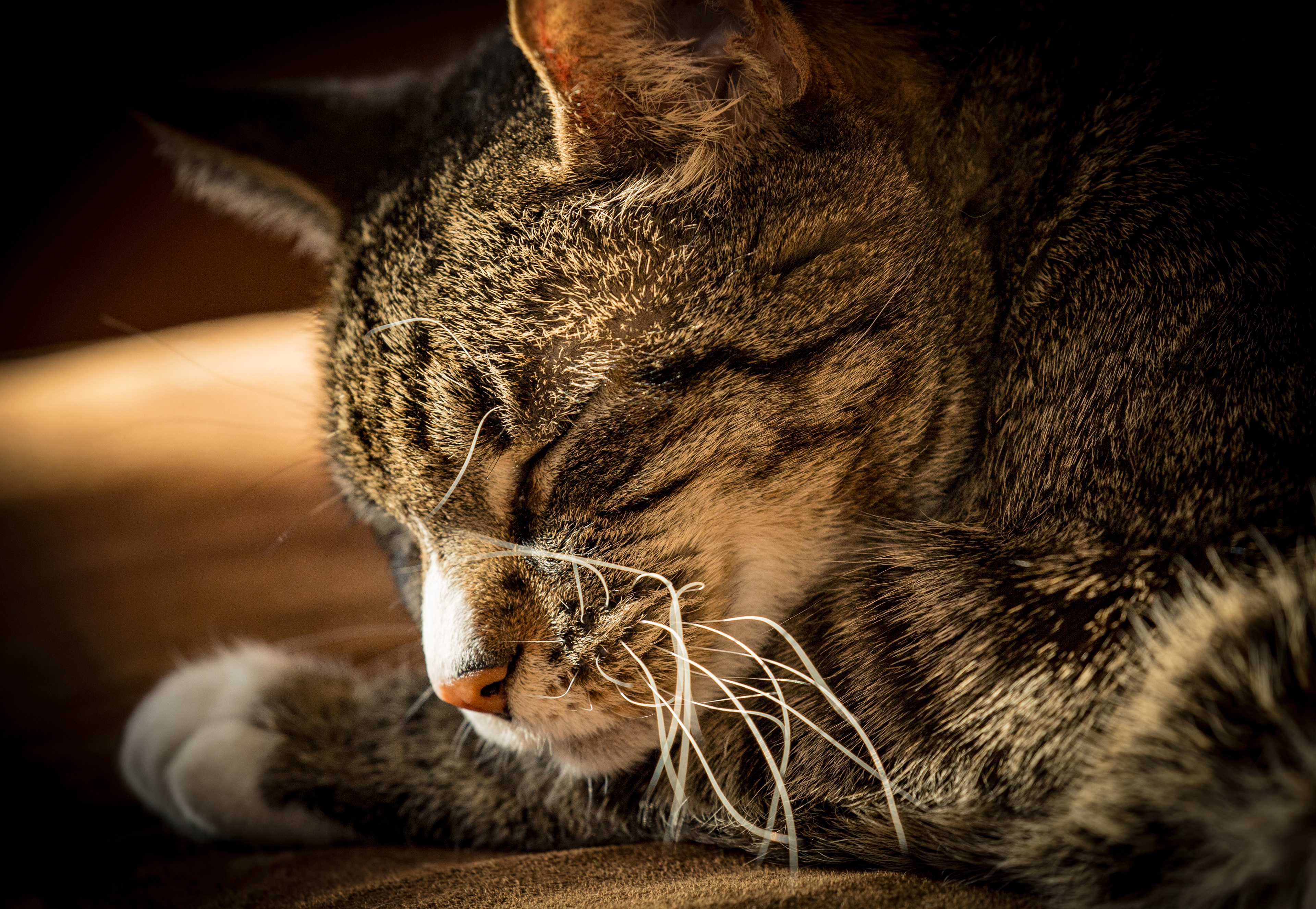 Mittens is 21 years young and acts more like a dog than a cat. He follows you around and wants you to pet him when he eats The good news is he sleeps a lot in sunny spot and does not mind getting his picture taken ... most of time.
